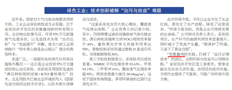 近日,**《六安新周報》**刊發(fā)專題報道《綠色工業(yè):技術創(chuàng)新破解“治污與效益”難題》,聚焦安徽鑫翊新材料有限公司在綠色發(fā)展道路上的實踐與探索。報道指出,安徽鑫翊打破了“治污必然增加成本”的傳統(tǒng)誤區(qū),證明環(huán)保與效益完全可以同頻共振。
